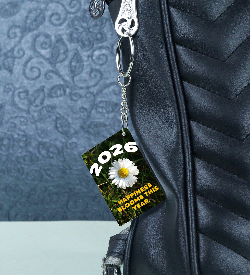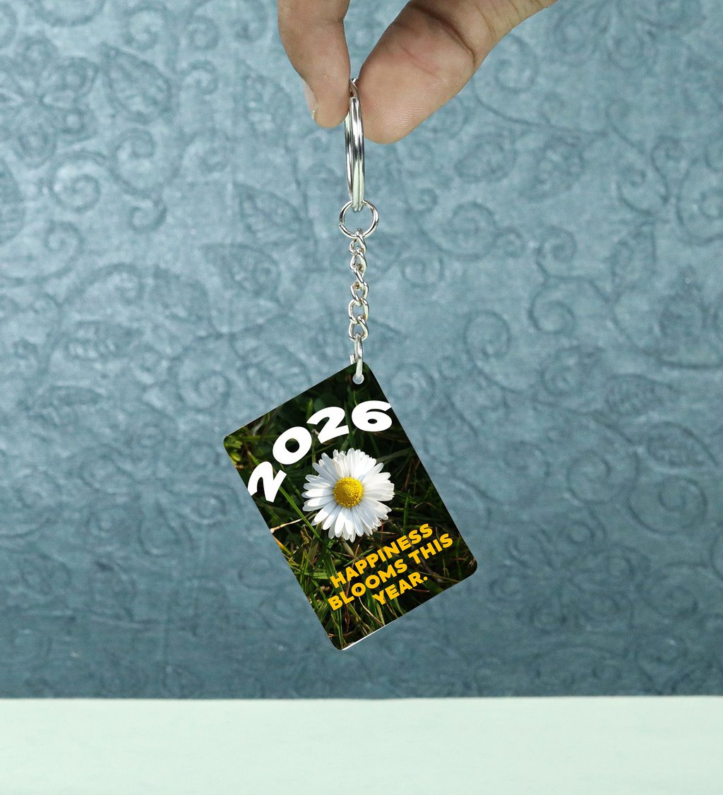 Charming White Daisy Flower Design Symbolizing the Happiness That Blooms Throughout 2026 Printed Keychain Pack of 2.