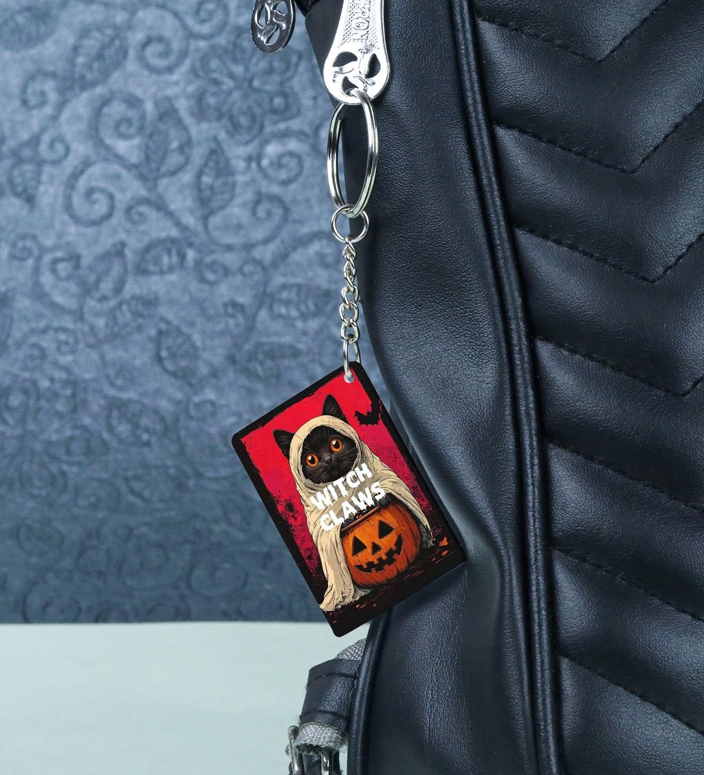 Add a dash of spooky charm to your everyday carry with this Halloween Cat rectangular keychain. Featuring a bewitching black cat design with eerie eyes and festive flair, it