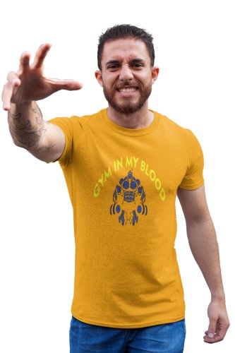 Gym In My Blood, Muscle Man- Blue, Round Neck Gym Tshirt (Yellow Tshirt) - Clothes for Gym Lovers - Suitable for Gym Going Person - Foremost Gifting Material for Your Friends and Close Ones