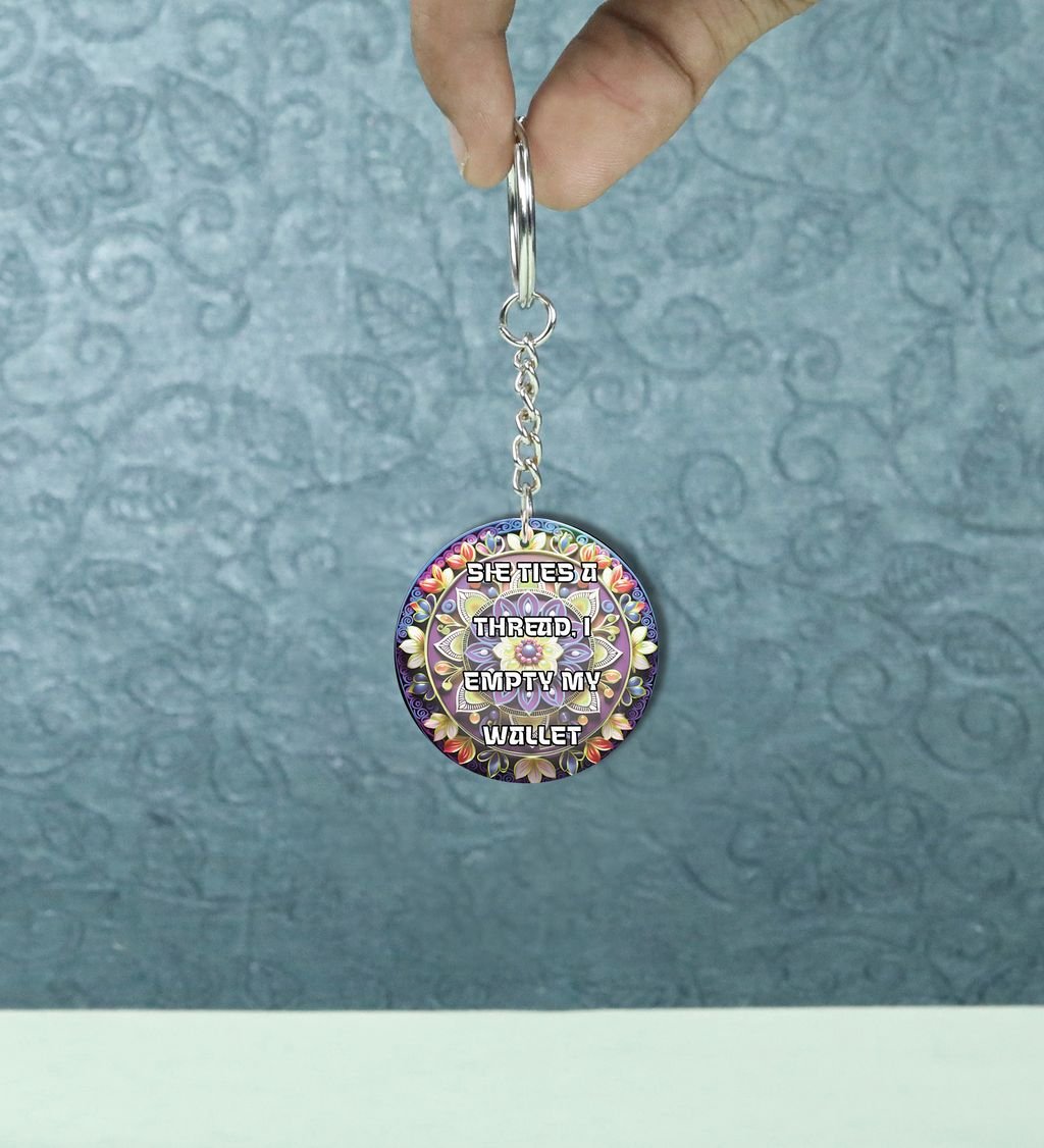 She Ties A Thread Funny Festival Quote Printed Round Keychain Pack of 2