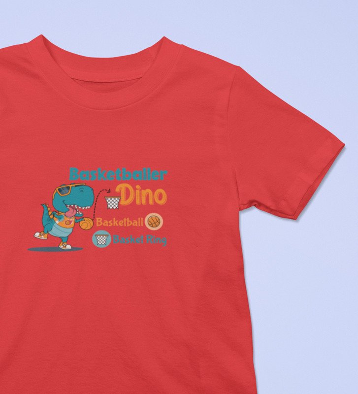 Basketballer Dino, Printed Cotton T-shirt (Red) for Boys