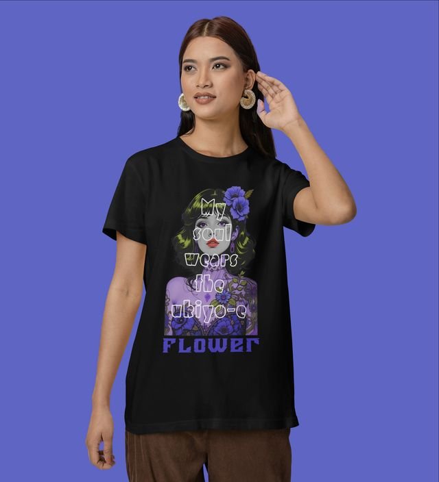 Soulful Petals: The Ukiyo-e Flower Within Graphic Printed Black T-Shirt